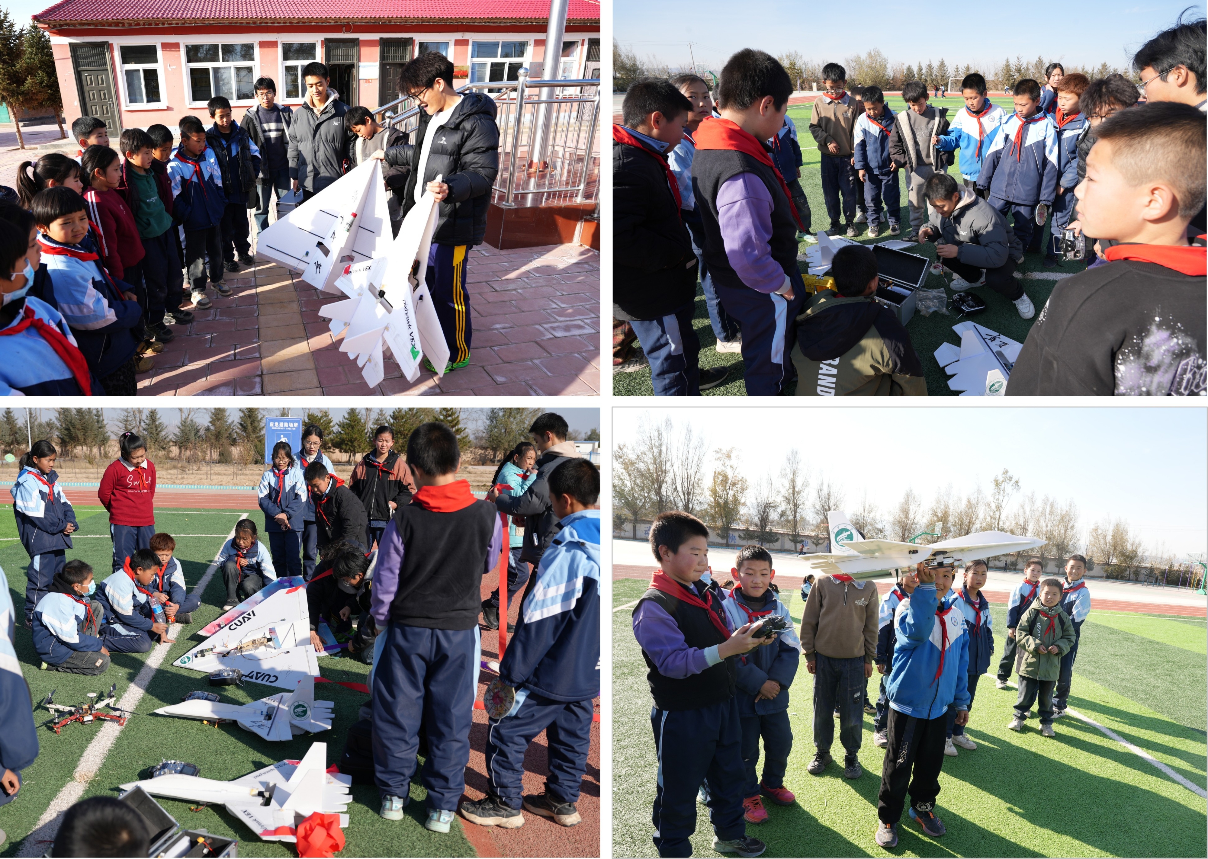 活动中,学院与马庄小学联合举办了“深耕教育服务 笃行实践育人 携手奋进强国行”主题教育活动,学院教师向小学生们发放了精心准备的学习用品和文体用品,勉励他们健康成长、勤奋学习,传递了学院的关怀与温暖。我校航模队为马庄小学的师生们带来了一场精彩纷呈的飞行器展演,伴随着螺旋桨的嗡鸣声,各类航模灵活升空、俯冲、盘旋,在空中翱翔,激发了孩子们对科学技术的浓厚兴趣与无限向往。