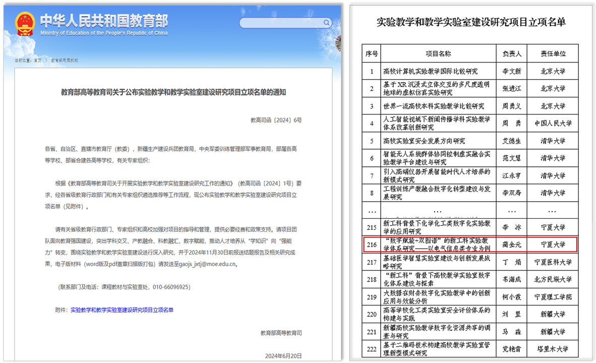 【电院讯 蔺金元/文、图】近日,教育部高等教育司公布了2024年实验教学和教学实验室建设研究项目立项名单,在宁夏高校获批的5个项目中,九游娱乐