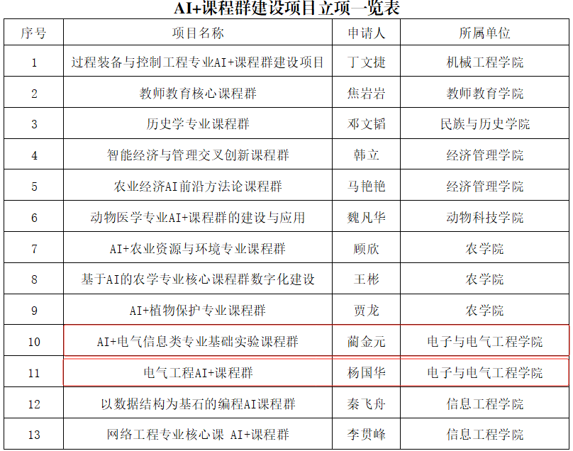 【电院讯 焦浩展/文、图】近日,学校公布2025年AI+课程群建设项目立项名单和第七批校级课程思政示范项目立项名单,全校共立项39项AI+课程群建设项目和20项课程思政示范项目,九游娱乐 杨国华教师团队《电气工程AI+课程群》和蔺金元教师团队《AI+电气信息专业基础实验课程群》获AI+课程群建设项目立项,魏春英教师团队《模拟电子技术》获校级课程思政建设立项。