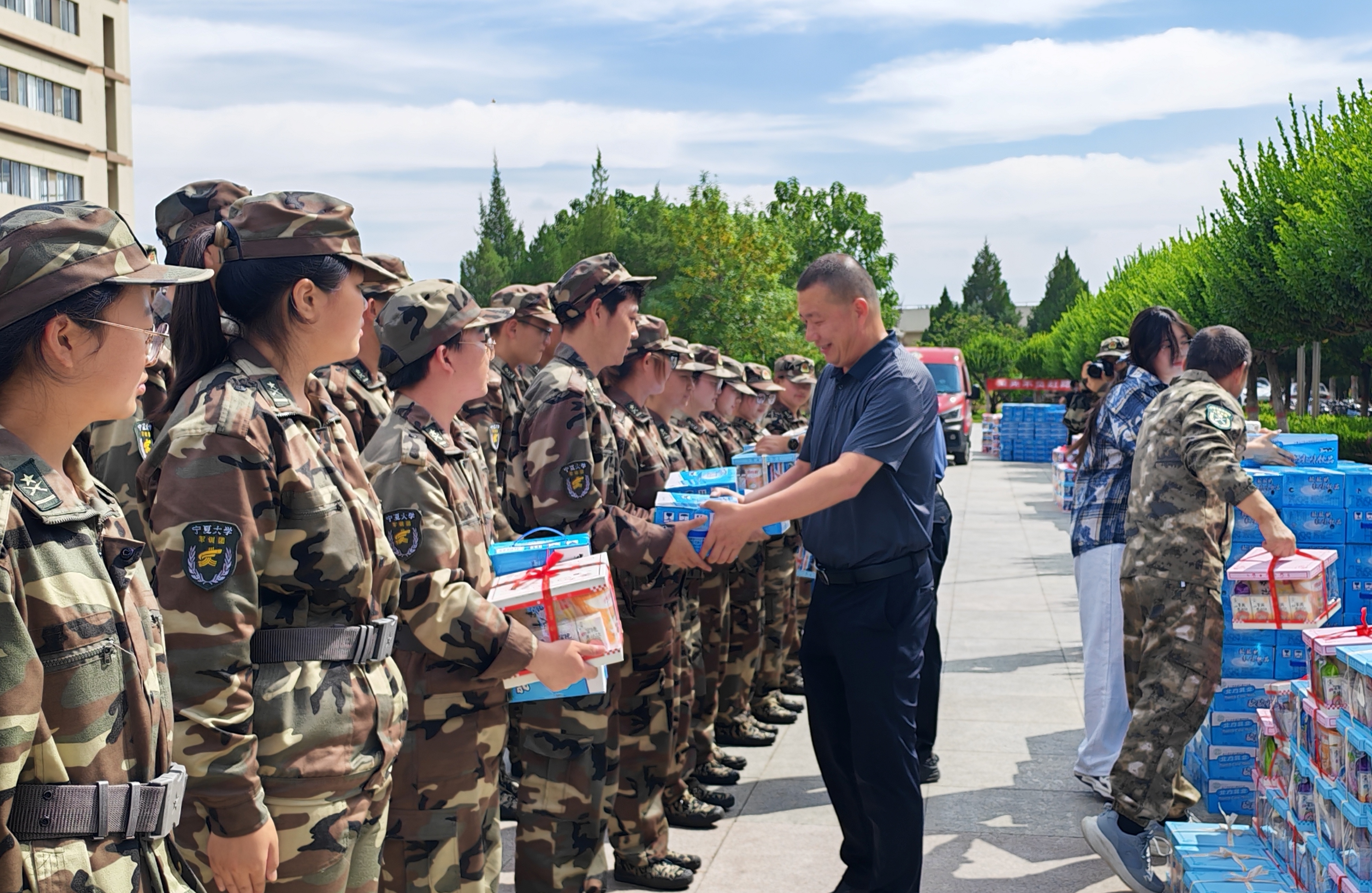 慰问过程中,学院与书院领导及老师们亲手将精心准备的慰问品递到同学们手中,细致询问大家的训练和生活情况,表达了学院与书院对同学们的深切关怀和美好祝愿。他们希望2025级新生能够将军训中培养出的优良作风和拼搏精神延续至今后的学习生活中,以更饱满的热情、更昂扬的姿态,全力以赴完成后续训练任务。